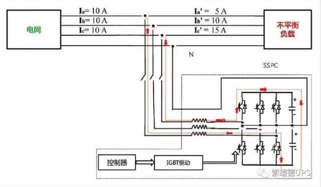 SSPC开启后,通过外接电流互感器(CT)实时检测系统电流,并将系统电流信息发送给内部控制器进行处理分析,以判断系统是否处于不平衡状态,同时计算出达到平衡状态时各相所需转换的电流值,然后将信号发送给内部IGBT并驱动其动作,将不平衡电流从电流大的相转移到电流小的相,最后达到三相平衡状态。