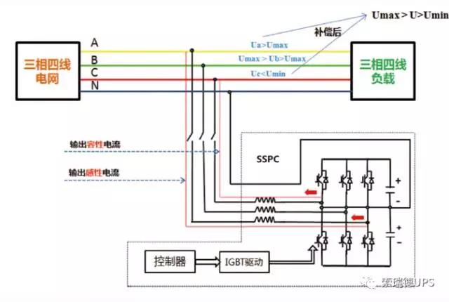 SSPC对补偿点电压进行采样,将电压信息传递给内部DSP,以判断补偿点电压是否超过设定值,当电压超过调压上线(Umax)时,SSPC输出感性电流,降低电压;当电压低于调压下线(Umax)时,SSPC输出电容性电流,提升电压,最终使各相电压稳定在正常范围内。